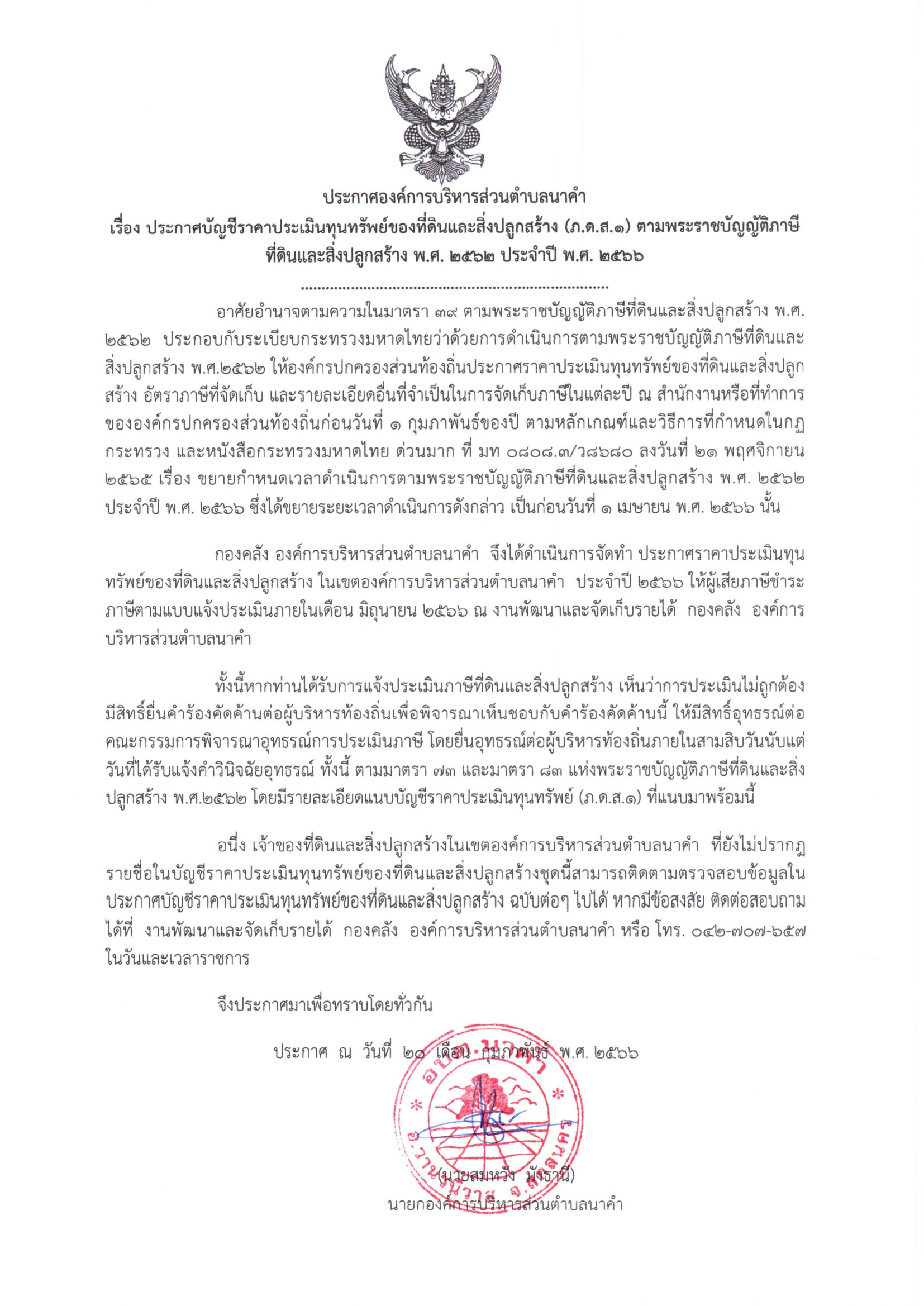 ประกาศองค์การบริหารส่วนตำบลนาคำ เรื่อง ประกาศราคาประเมินทุนทรัพย์ที่ดินและสิ่งปลูกสร้าง (ภ.ด.ส.1) ประจำปี 2566